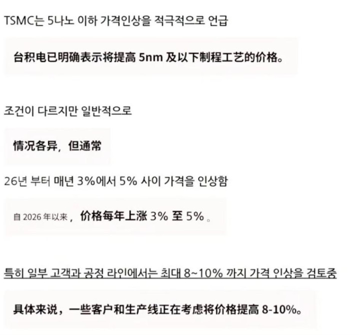 而这边刚热着,那边台积电又传出一个关键动向:已经通知主要客户,5nm 以下制程的制造成本将会上调,范围大致在 3%—5%,个别产线甚至可能触发 8%—10% 的涨幅。